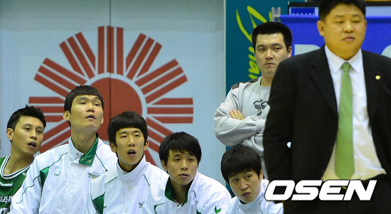 2쿼터 출전명단에서 제외된 동부 김주성이 동료선수들과 함께 벤치에서 경기를 지켜보고 있다.