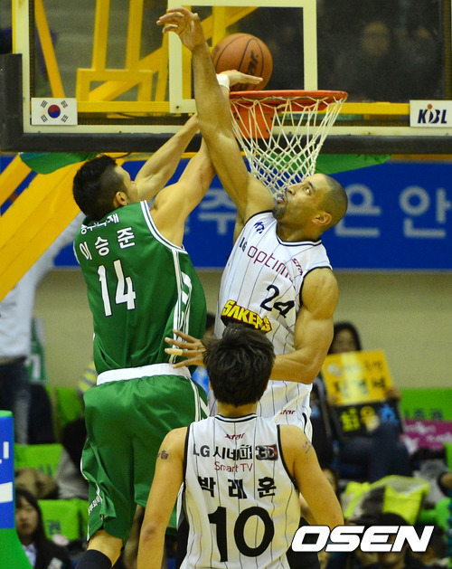 3쿼터 LG 클라크가 동부 이승준의 덩크를 파울로 차단하고 있다.