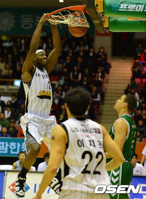 4쿼터 LG 벤슨에 동부 로비의 수비를 피해 투핸드 덩크를 성공시키고 있다.