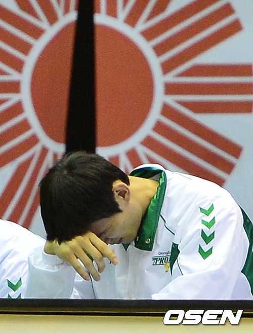 4쿼터 동부가 20점 가까이 뒤쳐지며 패색이 짙자 김주성이 벤치에서 아쉬워하고 있다. 김주성은 출전 명단에서 제외됐다.