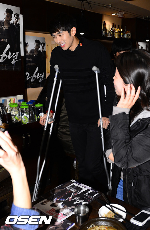 이날 '26년' 일일 포장마차에 참석한 임슬옹이 목발을 짚으며 팬에게 다가가고 있다.