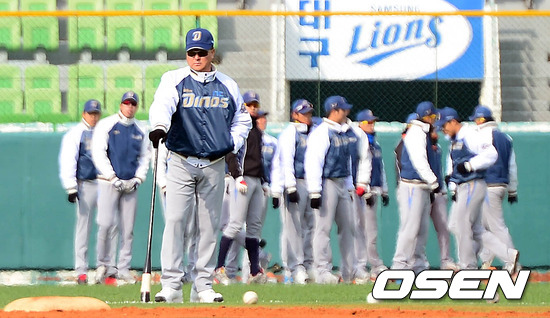 21일 오후 대구 시민구장에서 열린 아시아야구선수권대회 대표팀과 NC와의 연습경기 시작 전 김경문 감독이 대표팀 훈련을 지켜보고 있다.