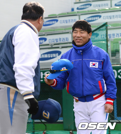 21일 오후 대구 시민구장에서 열린 아시아야구선수권대회 대표팀과 NC와의 연습경기 시작 전 이연수 대표팀 감독과 김경문 감독이 이야기를 나누고 있다.