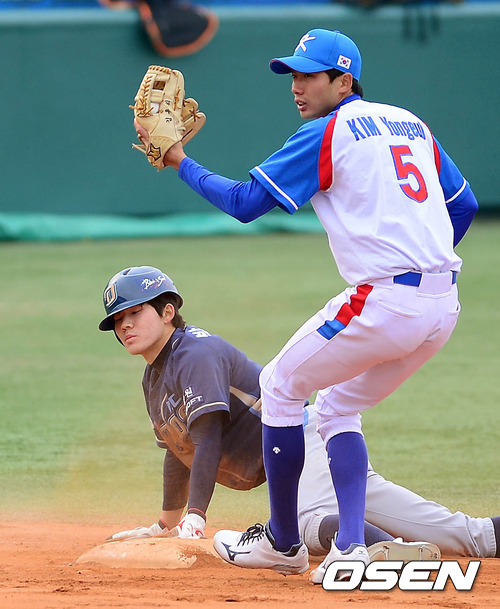 21일 오후 대구 시민구장에서 열린 아시아야구선수권대회 대표팀과 NC와의 연습경기 3회초 2사 1루 박으뜸의 안타 상황, 1루주자 박민우가 3루까지 쇄도, 아웃당하고 있다.