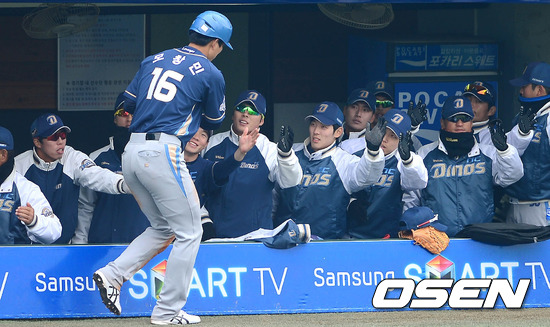 21일 오후 대구 시민구장에서 열린 아시아야구선수권대회 대표팀과 NC와의 연습경기 4회초 1사 3루 조영훈의 1타점 적시타에 홈을 밟은 3루주자 모창민이 덕아웃에서 동료들과 하이파이브를 하고 있다.