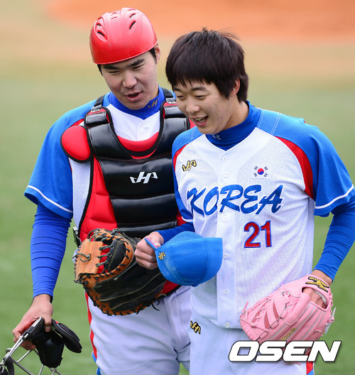 21일 오후 대구 시민구장에서 열린 아시아야구선수권대회 대표팀과 NC와의 연습경기 6회초 2사 모창민을 삼진으로 처리한 정인욱이 덕아웃으로 향하며 이재원과 미소를 짓고 있다.