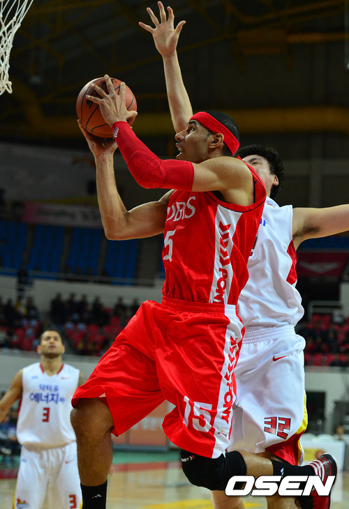 2쿼터 모비스 문태영이 오리온스 김승원의 수비를 피해 더블클러치를 성공시키고 있다.