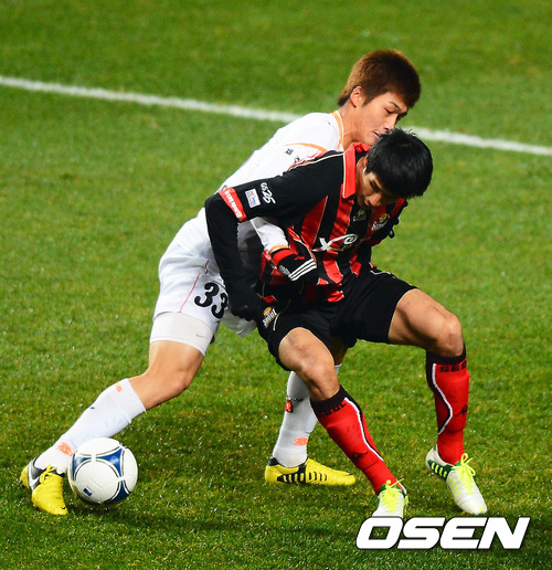 21일 오후 서울 마포구 성산동 서울월드컵경기장에서 열린 '현대오일뱅크 K리그 2012 41라운드' FC 서울과 제주 유나이티드와의 경기, 전반 FC 서울 정조국과 제주 한용수가 치열한 볼다툼을 하고 있다.