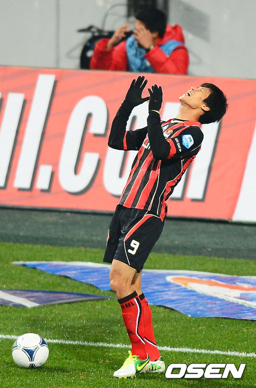 21일 오후 서울 마포구 성산동 서울월드컵경기장에서 열린 '현대오일뱅크 K리그 2012 41라운드' FC 서울과 제주 유나이티드와의 경기, 전반 FC 서울 정조국이 슛찬스를 놓친 후 아쉬워하고 있다.