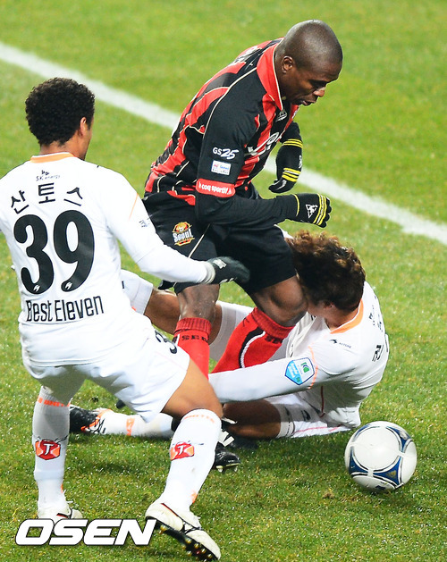 21일 오후 서울 마포구 성산동 서울월드컵경기장에서 열린 '현대오일뱅크 K리그 2012 41라운드' FC 서울과 제주 유나이티드와의 경기, 전반 FC 서울 아디가 돌파 도중 제주 권순형의 얼굴을 무릎으로 치고 있다.