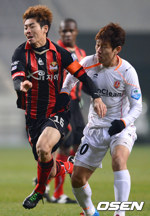 21일 오후 서울 마포구 성산동 서울월드컵경기장에서 열린 '현대오일뱅크 K리그 2012 41라운드' FC 서울과 제주 유나이티드와의 경기 전반 FC서울 하대성이 제주 배일환에게 파울을 얻어내고 있다