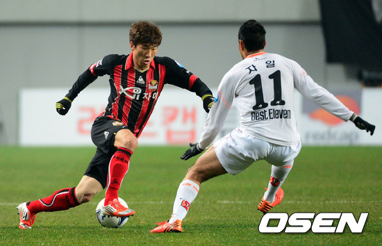 21일 오후 서울 마포구 성산동 서울월드컵경기장에서 열린 '현대오일뱅크 K리그 2012 41라운드' FC 서울과 제주 유나이티드와의 경기, 전반 서울 고요한이 제주 자일을 돌파하고 있다.