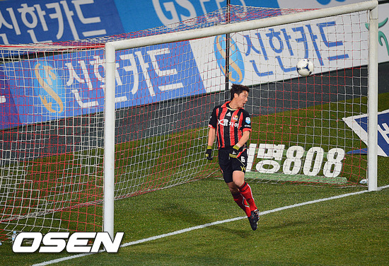 21일 오후 서울 마포구 성산동 서울월드컵경기장에서 열린 '현대오일뱅크 K리그 2012 41라운드' FC 서울과 제주 유나이티드와의 경기, 전반 FC 서울 김진규가 빈 골대로 날아오는 볼을 헤딩으로 걷어내고 있다.