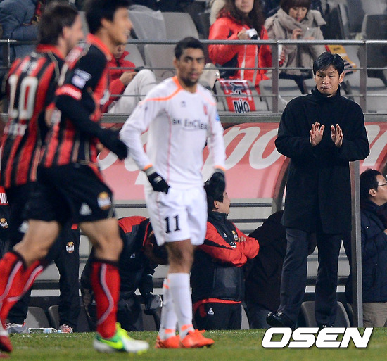 21일 오후 서울 마포구 성산동 서울월드컵경기장에서 열린 '현대오일뱅크 K리그 2012 41라운드' FC 서울과 제주 유나이티드와의 경기 전반 FC서울 정조국의 선취골때 최용수 감독이 박수를 치고 있다
