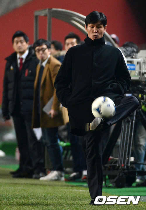 21일 오후 서울 마포구 성산동 서울월드컵경기장에서 열린 '현대오일뱅크 K리그 2012 41라운드' FC 서울과 제주 유나이티드와의 경기, 후반 서울 최용수 감독이 벤치로 날아온 공을 받아내고 있다.