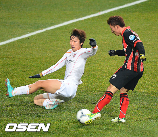 21일 오후 서울 마포구 성산동 서울월드컵경기장에서 열린 '현대오일뱅크 K리그 2012 41라운드' FC 서울과 제주 유나이티드와의 경기, 후반 FC 서울 최효진이 문전에서 강슛을 날리고 있다.