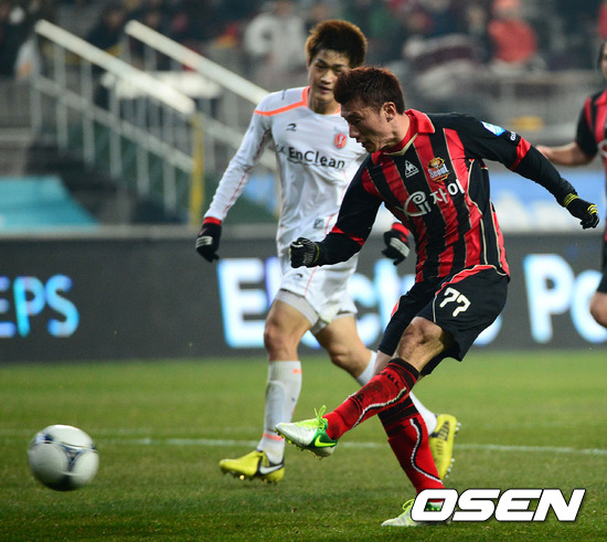 21일 오후 서울 마포구 성산동 서울월드컵경기장에서 열린 '현대오일뱅크 K리그 2012 41라운드' FC 서울과 제주 유나이티드와의 경기, 후반 서울 최효진이 슈팅을 하고 있다.