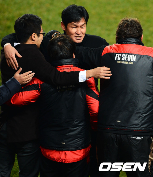 경기를 마치고 FC 서울 최용수 감독이 코치들과 포옹을 하고 있다. /rumi@osen.co.kr