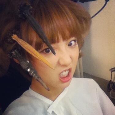 사진 속 민은 롤 빗 세개를 머리에 말아놓은 특이한 모습이다. 이를 보인채 장난스런 표정을 짓고 있는 모습이 웃음을 자아낸다.