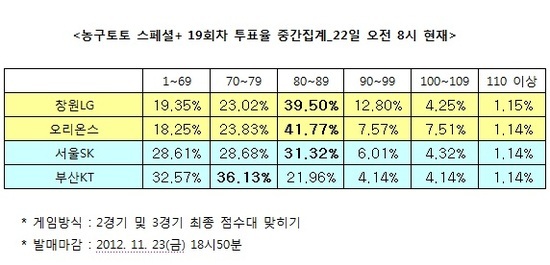 [농구토토] 국민체육진흥공단(www.kspo.or.kr)이 발행하는 체육진흥투표권 수탁사업자인 스포츠토토 공식 온라인 발매 사이트인 베트맨(www.betman.co.kr)은 오는 23일에 펼쳐지는 창원LG-오리온스(1경기), 서울SK-부산KT(2경기)전 등 한국프로농구(KBL) 2경기를 대상으로 한 농구토토 스페셜+ 19회차 투표율 중간집계 결과, 참가자들은 2경기 SK-KT전에서 홈팀 SK가 KT에 완승을 거둘 것으로 전망했다.