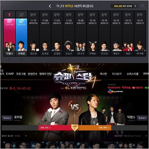 22일 오후 6시 마감된 사전 인터넷 투표에서 딕펑스는 33만 4749표를 획득하며 로이킴(33만 4733표)를 제쳤다. 딕펑스와 로이킴은 지난 6일 내내 100표 미만의 표차로 엎치락뒤치락 하는 박빙의 승부를 보여왔다.