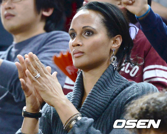 22일 오후 인천 삼산월드체육관에서 열린 'KB 국민카드 2012-2013 프로농구' 인천 전자랜드와 전주 KCC의 경기, 전자랜드 문태종 아내가 경기를 지켜보고 있다.