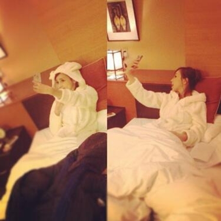 공개된 사진은 누군가 호텔로 보이는 곳의 침대에서 샤워 가운을 입고 사진을 찍는 아유미를 몰래 촬영한 것. 사진 속 그는 누군가 자신을 찍고 있다는 사실도 모른 채 깜찍한 표정을 지으며 '셀카 삼매경'에 빠져 있다.