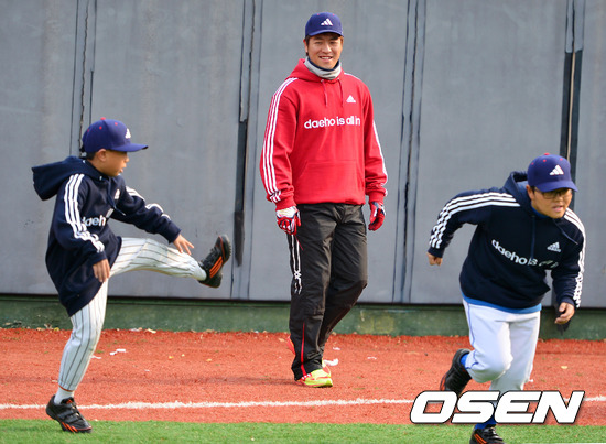 강민호가 유소년 선수들의 훈련을 바라보며 미소짓고 있다.