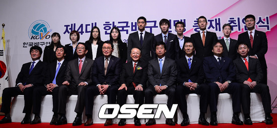 23일 오전 서울 소공동 롯데호텔에서 진행된 '제4대 한국배구연맹 총재 취임식'에서 한국배구연맹 구자준 총재가 감독 및 선수들과 포토타임을 갖고 있다.