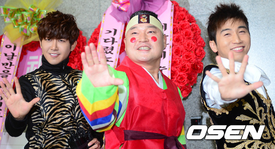 23일 오후 일산 MBC 드림센터에서 열린 '황금어장-무릎팍도사' 녹화 시작 전 강호동과 광희 유세윤이 취재진들에게 인사를 하고 있다.