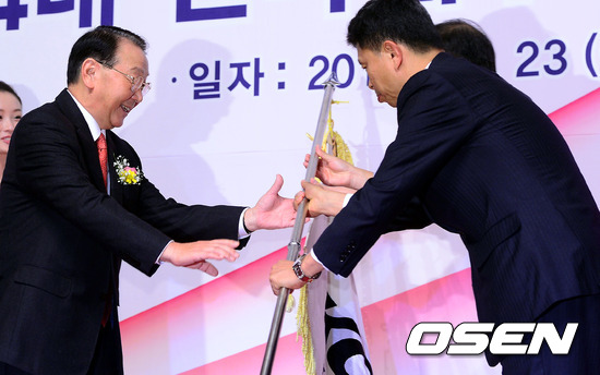 23일 오전 서울 소공동 롯데호텔에서 진행된 '제4대 한국배구연맹 총재 취임식'에서 한국배구연맹 구자준 총재가 연맹기를 전달받고 있다.