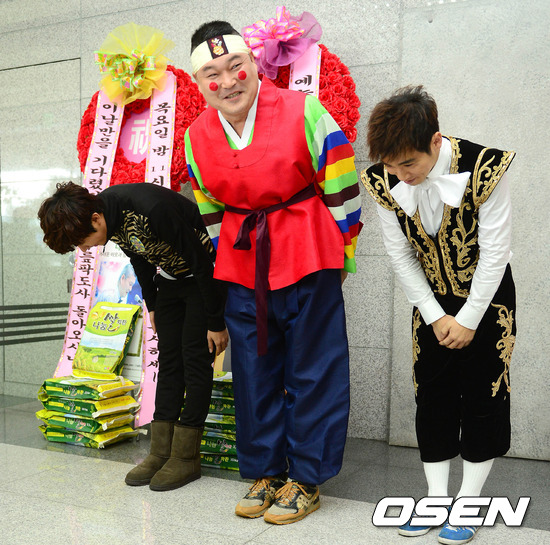 23일 오후 일산 MBC 드림센터에서 열린 '황금어장-무릎팍도사' 녹화 시작 전 강호동과 광희 유세윤이 취재진들에게 인사를 하고 있다.