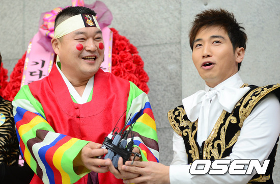 23일 오후 일산 MBC 드림센터에서 열린 '황금어장-무릎팍도사' 녹화 시작 전 강호동과 유세윤이 취재진들에게 인사말을 하고 있다.