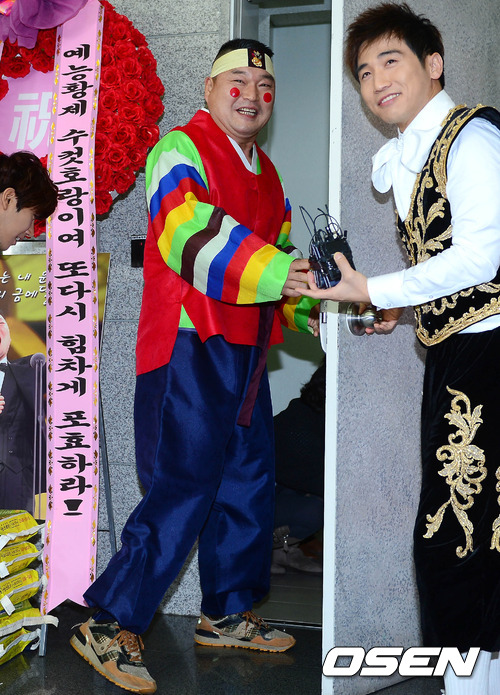23일 오후 일산 MBC 드림센터에서 열린 '황금어장-무릎팍도사' 녹화 시작 전 강호동이 취재진들에게 인사를 한 후 스튜디오로 향하고 있다.