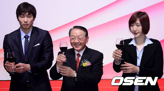 23일 오전 서울 소공동 롯데호텔에서 진행된 '제4대 한국배구연맹 총재 취임식'에서 한국배구연맹 구자준 총재가 대한항공 김학민 현대건설 황연주와 건배제의를 하고 있다.