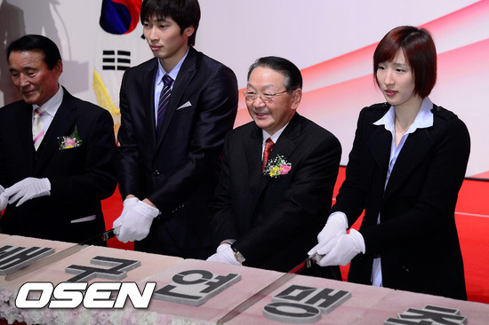 23일 오전 서울 소공동 롯데호텔에서 진행된 '제4대 한국배구연맹 총재 취임식'에서 한국배구연맹 구자준 총재가 대한항공 김학민과 현대건설 황연주와 함께 축하떡을 자르고 있다.