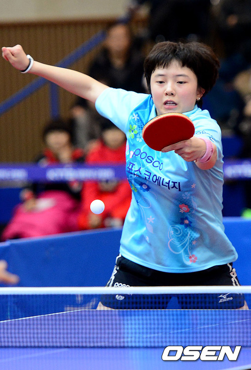 23일 오후 경기도 안양 호계체육관에서 열린 '하나은행 2012 MBC 탁구 최강전' 남녀 개인 단식 준결승전에서 포스코에너지 전지희가 강력한 백핸드 공격을 시도하고 있다.
