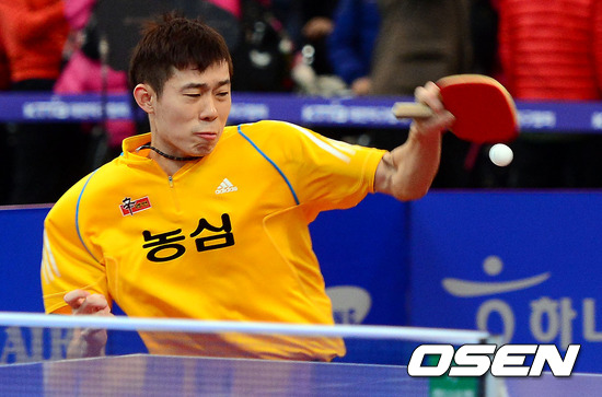 23일 오후 경기도 안양 호계체육관에서 열린 '하나은행 2012 MBC 탁구 최강전' 남녀 개인 단식 준결승전에서 농심 이정우가 강력한 스매싱을 날리고 있다.