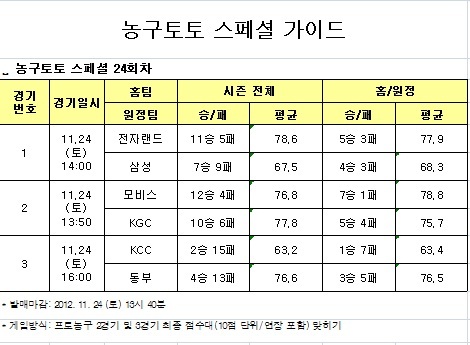 [농구토토] 국민체육진흥공단(www.kspo.or.kr)이 발행하는 스포츠토토 공식 온라인 발매 사이트인 베트맨(www.betman.co.kr)은 오는 24일 오후 1시 50분 부터 펼쳐지는 전자랜드-삼성(1경기), 모비스-KGC(2경기), KCC-동부(3경기)전 등 국내 프로농구 3경기를 대상으로 한 농구토토 스페셜 24회차 투표율 중간집계 결과, 참가자들은 1경기 전자랜드-삼성전에서 전자랜드의 승리를 예상하고 있다고 밝혔다.