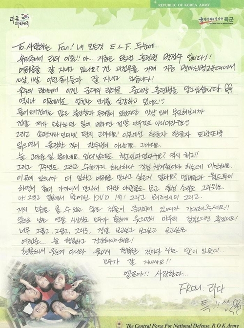이특은 편지에서 "To.사랑하는 Fan! 내 모든 것 E.L.F. 두 눈에. 슈퍼주니어 리더 이특! 지금은 85번 훈련병 박정수입니다. 여러분들 잘 지내고 있나요? 전 의정부를 거쳐 지금 백마신병교육대에서 10살, 11살 어린 동기들과 잘 지내고 있습니다"라고 말문을 열였다.
