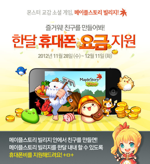 또 JCE는 ‘메이플스토리 빌리지’의 iOS 버전 출시를 기념해 11월 28일부터 12월 11일까지 게임 내 친구를 50명 이상 등록한 유저에게 추첨을 통해 모바일 문화상품권을 선물로 제공하는 ‘한달 휴대폰 요금지원 이벤트’를 진행한다.
