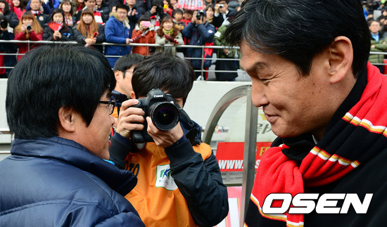 경기에 앞서 전북 이흥실 감독과 서울 최용수 감독이 악수를 하며 인사하고 있다.