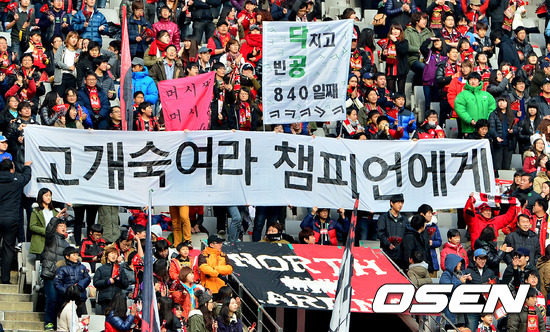 전반 서울 서포터즈가 플래카드를 들고 열띤 응원을 선보이고 있다.