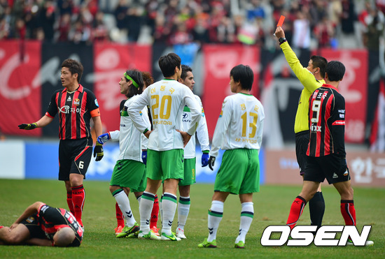 전반 전북 에닝요가 서울 에스쿠로데에게 파울을 범하고 경고 누적으로 퇴장당하고 있다.