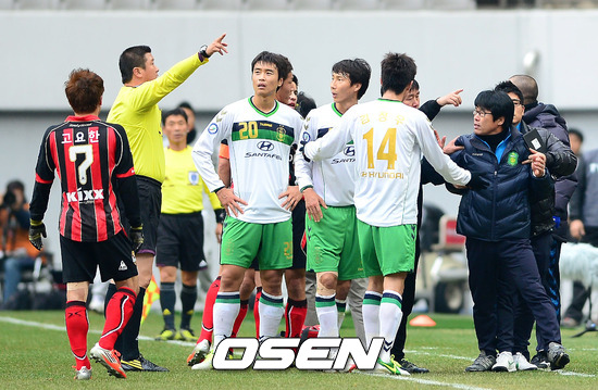 전반 전북 에닝요의 퇴장에 이흥실 감독이 심판진을 향해 어필을 하고 있다.