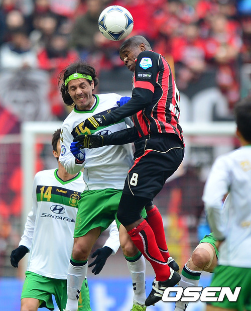 전반 서울 아디와 전북 드로겟이 공중볼을 다투고 있다.