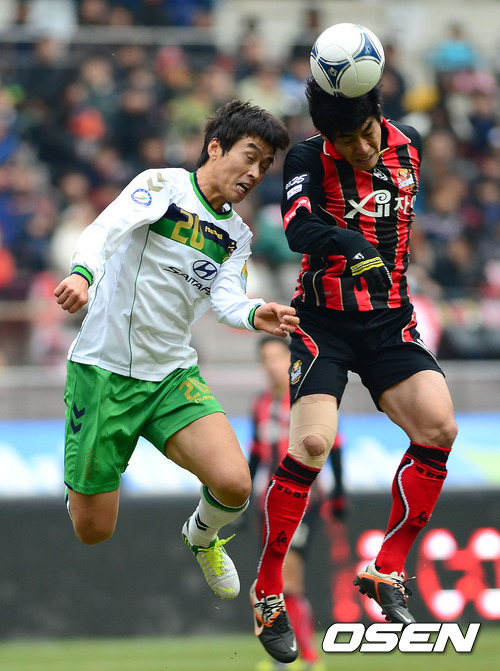전반 전북 이동국과 서울 김주영이 공중볼 다툼을 하고 있다.