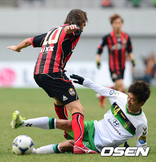 후반 서울 데얀과 전북 김정우가 충돌하고 있다.