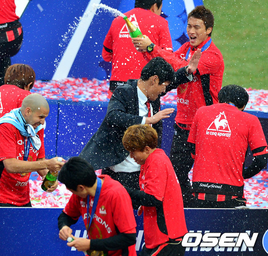 경기후 서울 최용수 감독이 샴페인 세리머니에 줄행랑일 치고 있다./jpnews@osen.co.kr