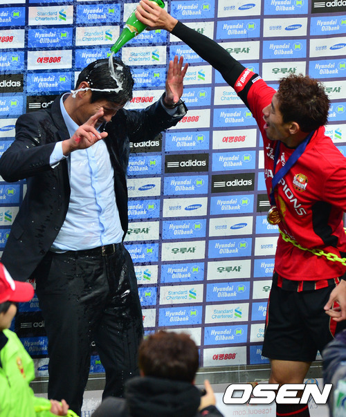 경기후 서울 하대성이 인터뷰중인 최용수 감독에게 샴페인을 뿌리고 있다./jpnews@osen.co.kr